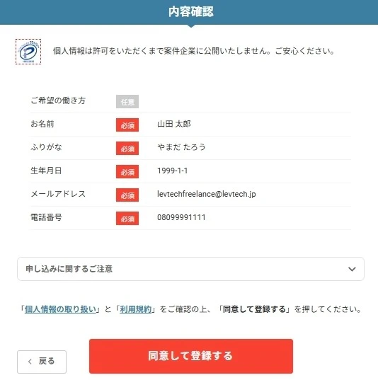 全ての項目を入力後、「個人情報の取り扱い」と「利用規約」を確認して、「同意して登録する」ボタンを押して完了です。