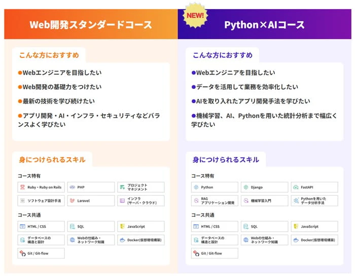 Web開発スタンダードコースは24回払いで月31,600円(税込)~、Python×AIコースは月26,400円(税込)〜受講できます。