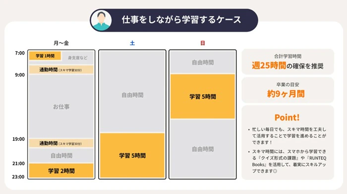 RUNTEQは、未経験から学習を始める受講者が非常に多いスクールであり、9か月間という長い期間で基礎から学べる点が魅力です。